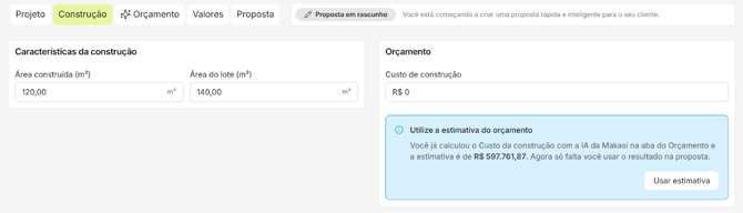 Essa estimativa será incluída no campo ‘Custo de construção’ que fica na aba de ‘Construção’ e será considerada nos cálculos da proposta de crédito.