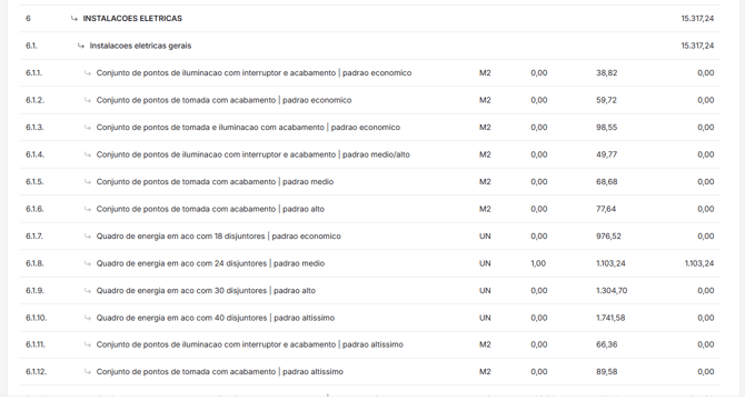 - Ao clicar na seta de cada macro-etapa você consegue visualizar 2 níveis abaixo de detalhe do que está sendo considerado nesse orçamento e seus valores unitários.
