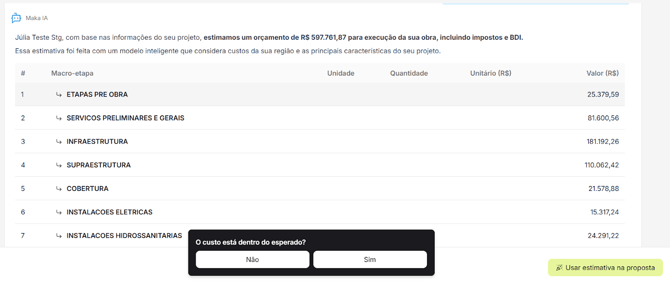 Só é elegível a funcionalidade projetos com os métodos construtivos de Alvenaria estrutural e Alvenaria de vedação. Confira se o seu projeto será feito nesse método e se está selecionado corretamente na plataforma da Makasí. - Posso editar alguma resposta do Orçamento com IA?